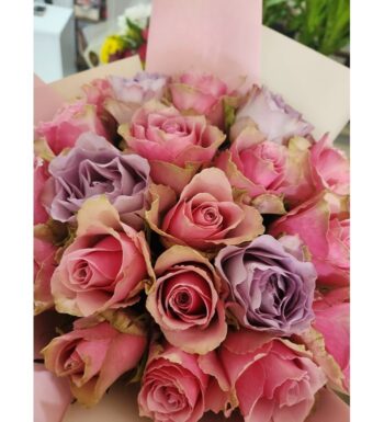 Beyaz ve pembe lisyantuslara lila güller eşlik ediyor